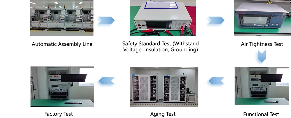 Produsul a obținut certificări autorizate în țară și în străinătate, inclusiv CCC (China Compulsory Certification), CE (Uniunea Europeană), UL (Statele Unite) și EN50498. Respectă standardele NB/T33001-2025 și GB31241-2014, asigurând siguranța electrică și compatibilitatea electromagnetică. Deținem o bază de producție modernă și adoptăm o carcasă din material compozit ABS+PC ignifug, cu rating V0 și plăci PCB din fibră de sticlă FR-4. Îmbinările de lipit cheie sunt procesate folosind tehnologia de lipit prin valuri și au trecut teste riguroase, cum ar fi 5.000 de cicluri de inserare/extracție, rezistență la vibrații și rezistență la coroziune prin pulverizare de sare. Fiecare unitate este supusă unui test de îmbătrânire la sarcină completă de 72 de ore înainte de a părăsi fabrica, obținând o rată de calificare de 100%. Am stabilit un sistem cuprinzător de control al calității care permite trasabilitatea completă de la achiziționarea de materii prime până la livrarea produsului finit.