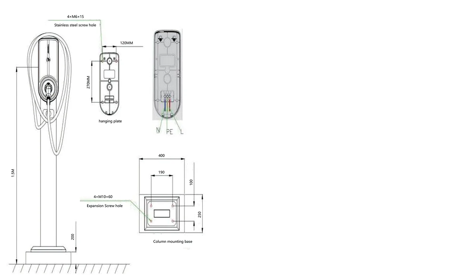 1) Fundația de beton pentru grămada de încărcare ar trebui să aibă o rezistență de C25. Partea subterană este de 400 mm, iar partea supraterană este de 200 mm. Dimensiunile betonului sunt 400*250mm. Fundația ar trebui să aibă o țeavă de evacuare îngropată în centru și 4 șuruburi de expansiune M10*60 trebuie fixate pe fundație.