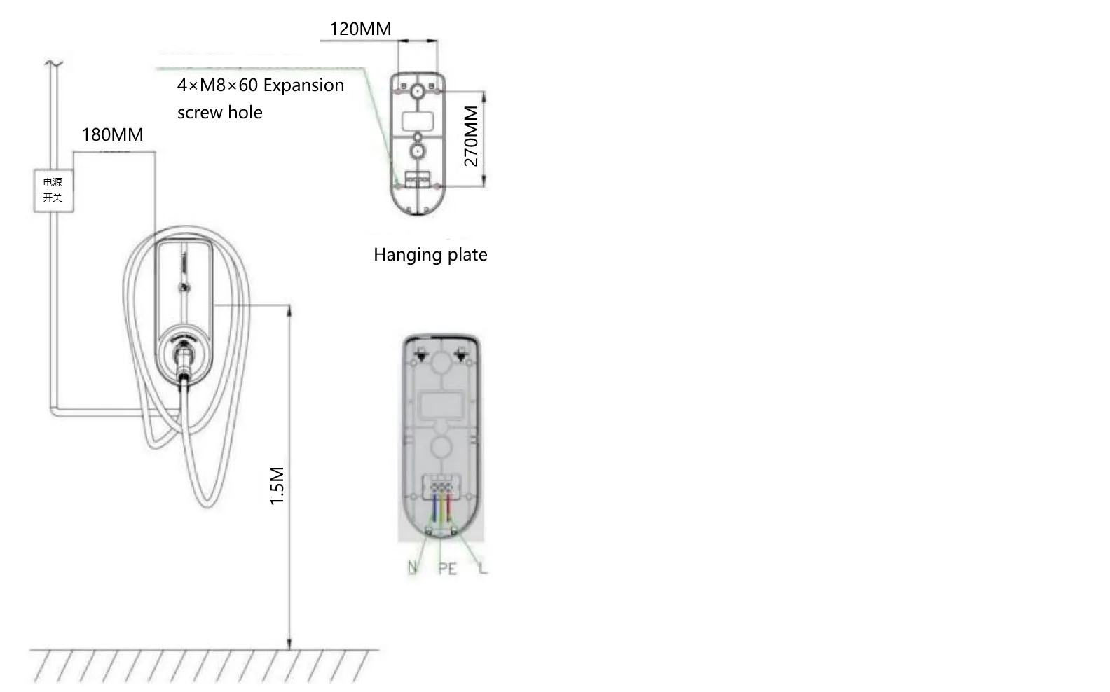 1) Datele de referință ale înălțimii grămezii de încărcare de la sol (1,3-1,5 metri)2) Marcați poziția orificiului de montare pe placa din spate pe perete în funcție de poziția orificiului de montare pe placa din spate.